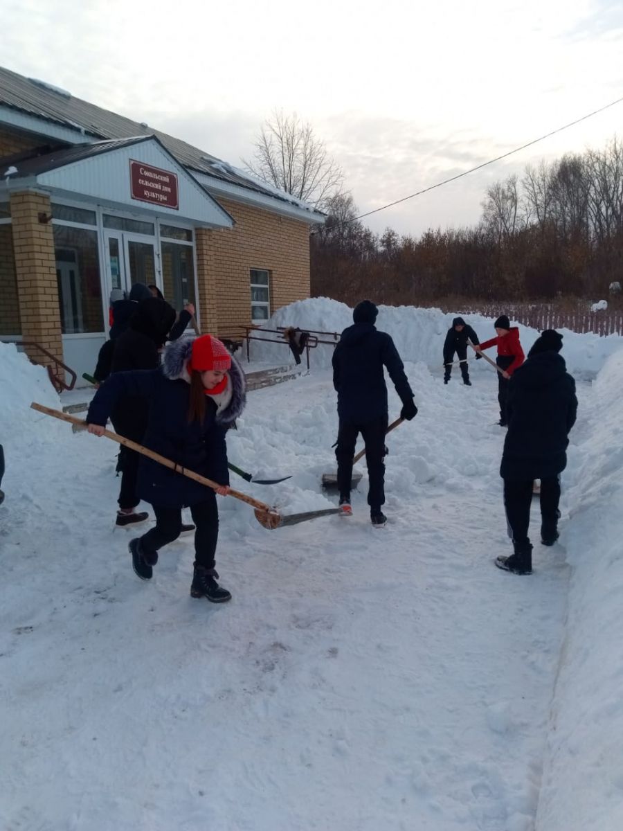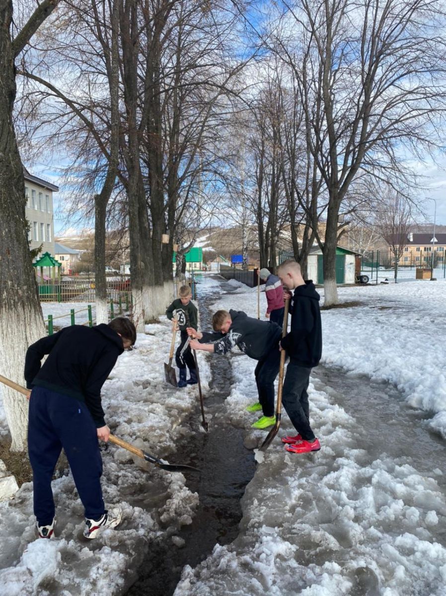 - в чистый четверг воспитанники старших групп навели порядок на школьной территории и помогли с очисткой территории от снега сельскому клубу.