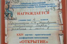 Ученица 4-ого класса АНО ОО "Прогимназия №14" Татьянченко Мария приняла участие в XXIV научно-практической конференции школьников "Открытие" города Бугульмы. Маша стала победителем, заняла почетное 1 место. Молодец! Так держать, Мария!
