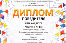 Подведены итоги очной олимпиады для школьников 1-6 классов "Эрудит" по предмету Окружающий мир. Поздравляем Победителя Асадулину Софию, воспитанницу подготовительной группы АНО ОО "Прогимназия №14". Желаем успехов и дальнейших побед"!!!