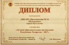Второй год подряд АНО ОО "Прогимназия №14" города Бугульмы награждается дипломом Министерства образования и науки Республики Татарстан "Лучшая образовательная организация Республики Татарстан - 2017".