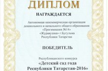 В условиях жесткой конкуренции, пройдя рейтинговые критерии АНО «Прогимназия № 14 «Журавушка» (вошла в 20 лучших детских садов) стала ПОБЕДИТЕЛЕМ Республиканского конкурса «Детский сад года Республики Татарстан -2016».