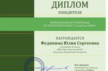 А Миргалимова Аделя, ученица 2 класса АНО «Прогимназия № 14» выполнила задания и за русскую группу, и за татарскую, в обеих номинациях является победителем олимпиады. Все ребята, принявшие участие в дистанционной международной олимпиаде, получили Сертификаты об участии. За подготовку ребят благодарим учителей татарского языка и литературы Галиеву Венеру Салимовну и Закирову Лейсан Магсумовну.
