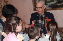 70 лет назад он стоял на защите Родины, а сегодня без посторонней помощи едва держится на ногах. За плечами потери, боль, память о той, довоенной жизни. Сегодня дети нашей группы узнали его историю, посчитали и посмотрели медали, и увидели новую – выпущенную к 70 – летию Победы. Со словами благодарности за подвиг, совершенный в годы войны, наши дети исполнили песни и прочитали стихи ветерану ВОВ, вручили свою собственную медаль.