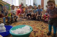Ребята младшей группы № 1 АНО "Прогимназия № 14" познакомились со свойствами снега: слепили из него снеговика, самостоятельно раскрасили его гуашью: нарисовали глазки, ротик, поставили морковку вместо носа, надели ведро на голову. А затем наблюдали, как он в теплой групповой комнате медленно таял. После сна дети увидели, что от снеговика осталась только водичка. С помощью беседы и наблюдения выяснили, что снег бывает белым, холодным, пушистым, липким.