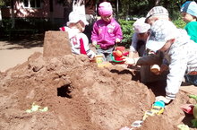 Дети группы № 10 прогимназии «Журавушка» совместно с воспитателем Лапшовой Анной Николаевной в рамках тематической недели "Мой город - Бугульма!" из различных форм для песка, построили песчаный город на своём участке. Они раскапывали ямки, насыпали холмики, рыли туннели, строили мостики. В свои постройки дети добавляли природный материал, миниатюрные фигурки, игрушки и тогда появлялся целый песочный город. Здесь можно было увидеть автомобильные дороги, подземные туннели, котлованы, башни с уникальными флагами. Дети получили возможность не только применить свои конструктивные способности и творчество на практике, но и обыграть постройку.
