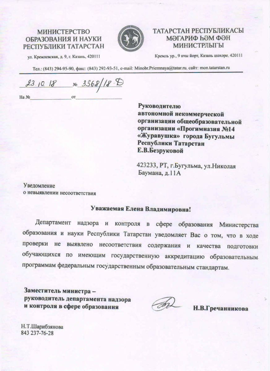 МОиН РТ Уведомление о не выявлении несоответствия от 23.10.2018г.