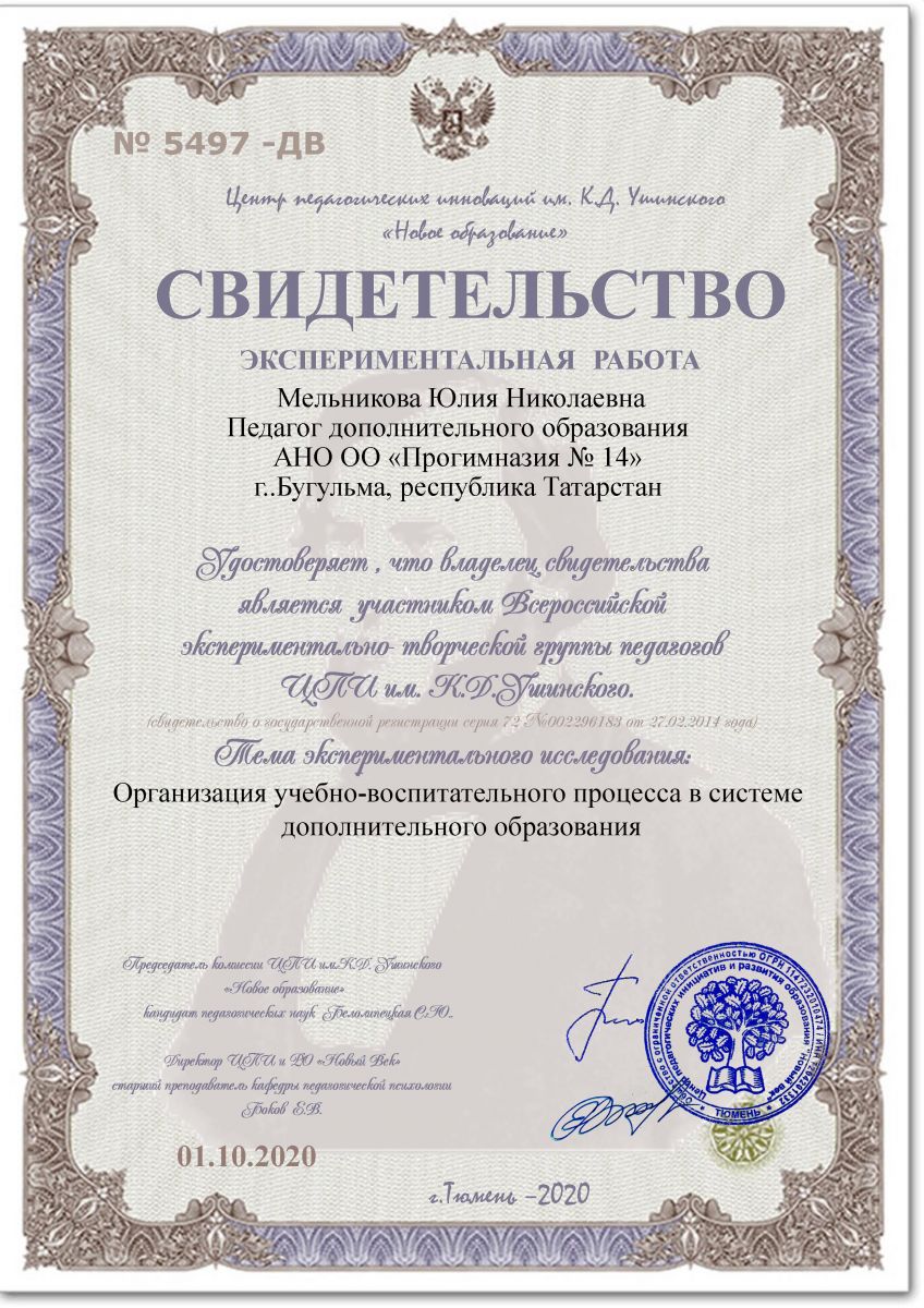 Свидетельство экспериментальной работы педагога ДОП Мельниковой Ю. Н.