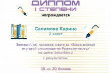 Ученица 2 класса Салимова Карина участвовала во "Всероссийской итоговой олимпиаде по Русскому языку", заняла призовое место и награждена Дипломом I степени. Поздравляем!!!