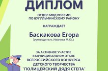 Отдел МВД России по Бугульминскому району награждает дипломом Баскакова Егора за активное участие в муниципальном этапе Всероссийского конкурса детского творчества "Полицейский дядя Степа". Руководитель Иванова М.Ю. Поздравляем!