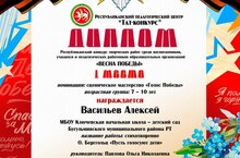 Ученик 3 класса Васильев Алексей принял участие в республиканском конкурсе творческих работ "Весна Победы", номинация: сценическое мастерство "Голос Победы", занял 1 - е место, награжден дипломом. Руководитель: Павлова О.Н. Поздравляем, молодцы!