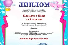 Всероссийское образовательное издание "Педразвитие" награждает дипломом Баскакова Егора за 1-е место во всероссийской викторине "Самый умный дошколёнок!" Куратор: воспитатель Иванова М.Ю. Поздравляем!!!