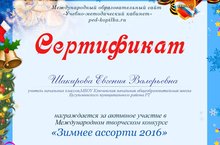 Учитель начальных классов Шакирова Евгения Валерьевна награждена сертификатом за активное участие в Международном конкурсе "Зимнее ассорти 2016". Название конкурсной работы: "Детская сказка для 4-8 лет. Поздравляем!!!