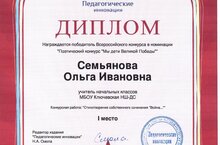 Учитель начальных классов МБОУ Ключевская НШ-ДС Семьянова О.И. принимала участие во Всероссийском конкурсе в номинации «Поэтический конкурс «Мы дети Великой Победы»» и заняла I место. На конкурс было представлено стихотворение собственного сочинения «Война…».