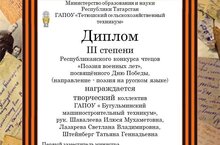 Творческий коллектив нашего техникума под руководством Шавалеевой И.М., Лазаревой С.В. и Штейнберг Т.Г., принял участие в Республиканском конкурсе чтецов «Поэзия военных лет», посвященном Дню Победы (направление - поэзия на русском языке).