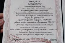 Скачков Вадим, Ишмуратова Камилла и Воронцов Даниил заняли 2 место в Республиканском конкурсе социально-ориентированных проектов "Проект студента 2021" среди студентов среднего профессионального образования РТ.