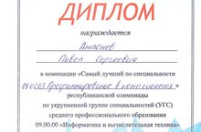Студент 746 группы Антонов Павел на Республиканском этапе Всероссийской олимпиады профмастерства по укрупненной группе специальностей 09.00.00 Информатика и вычислительная техника, стал победителем в номинации "Лучший по специальности 09.02.03 Программирование в компьютерных системах".