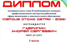 Поздравляем Гаврилина Андрея Сергеевича с заслуженным первым местом в муниципальном этапе Республиканского конкурса профессионального мастерства работников сферы воспитания и дополнительного образования «Сердце отдаю детям-2026»!