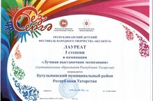 18 ноября в г. Казань состоялся Ежегодный Республиканский фестиваль народного творчества "Без Берге". В этом году фестиваль объединил более 35 тысяч участников. В фестивале принимают участие педагоги дополнительного образования и обучающиеся студий с 45 районов Республики Татарстан. Участники фестиваля Бугульминского муниципального района заняли призовые места практически во всех номинациях фестиваля. На базе Казанского института культуры прошел гала-концерт и торжественное награждение победителей фестиваля . Педагоги учреждений дополнительного образования Бугульминского района в этом году организовали работу с детьми по направлению сохранения народных традиций на высшем уровне. И как результат работы - Бугульминский муниципальный район стал лауреатом 1 степени в номинации "Лучшая выставочная композиция".