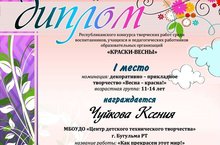 Воспитанница МБОУ ДО ЦДТТ Ксения Чуйкова награждена Дипломом за I место в Республиканском конкурсе "Краски весны".