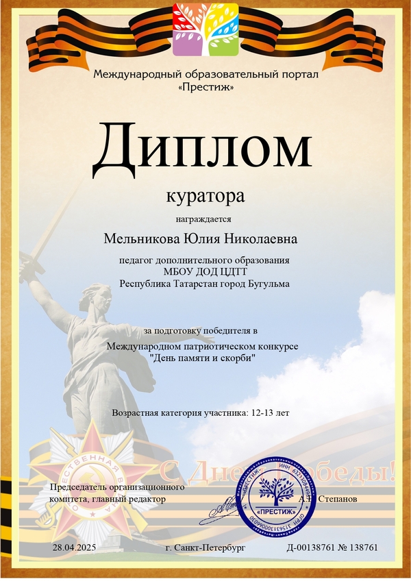 19. Международный патриотический конкурс «День памяти и скорби» Диплом Куратора Диплом Куратора