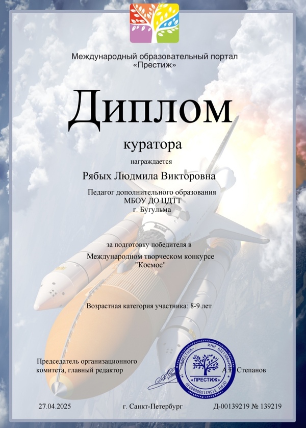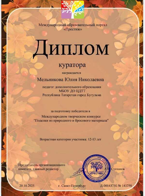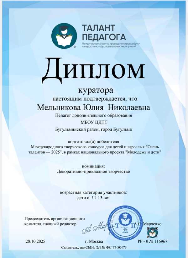 12. Международный творческий конкурс для детей и взрослых «Осень талантов-2025», в рамках национального проекта «Молодежь и дети» Диплом куратора