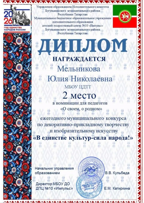 27. Ежегодный муниципальный конкурс по декоративно-прикладному творчеству и изобразительному искусству «В единстве культур-сила народа!», номинация для педагогов «О своем, о родном» Диплом 2 место