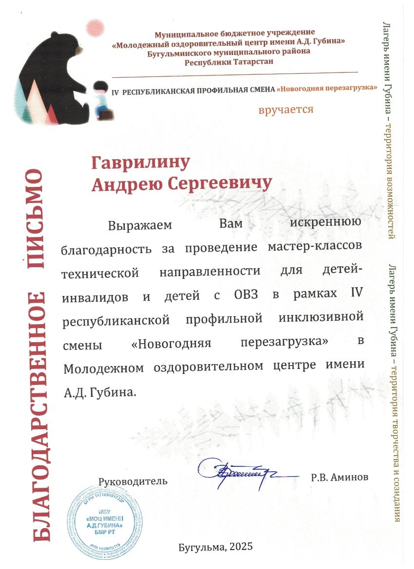 19. Мастер-класс технической направленности для детей-инвалидов и детей с ОВЗ в рамках IV республиканской профильной инклюзивной смены "Новогодняя перезагрузка" Благодарственное письмо