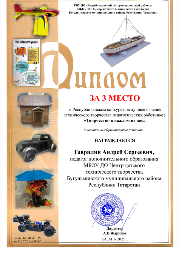 25. Всероссийский конкурс профессионального мастерства работников сферы дополнительного образования «Сердце отдаю детям - 2024»: Муниципальный этап – номинация «Педагог дополнительного образования по технической направленности» - Гаврилин А.С. - 1 место Протокол муниципальный этапУчастник I и II туров Республиканского заочного этапа.