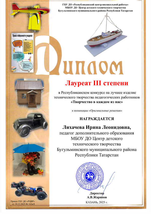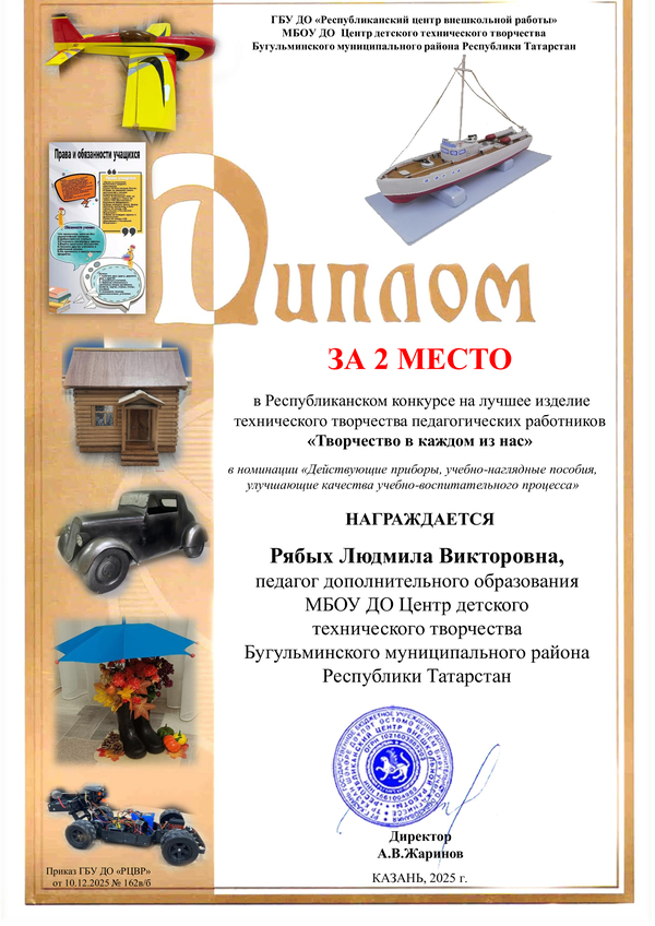 23. Республиканский конкурс на лучшее изделие технического творчества педагогических работников "Творчество в каждом из нас" Диплом 1 место Диплом 2 место Диплом 2 место Диплом 3 место Диплом за творческий подход Диплом за творческий подход Диплом за творческий подход Сертификат