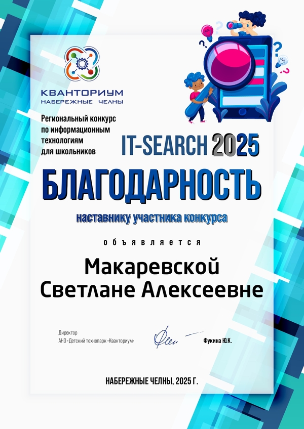 18. Региональный конкурс по информационным технологиям для школьников IT-SEARCH 2025 Благодарность