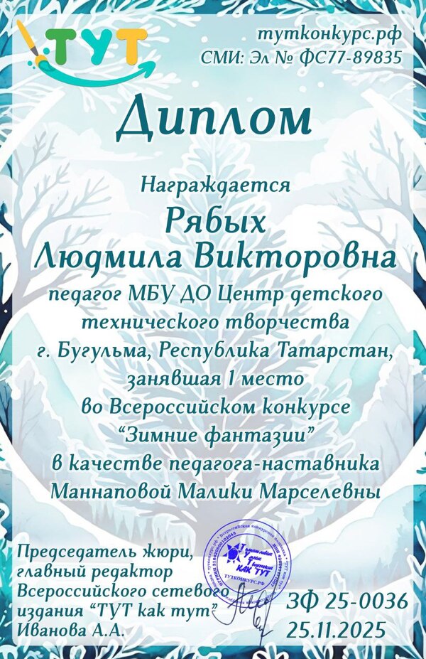 17. Всероссийский конкурс «Зимние фантазии» Диплом наставника