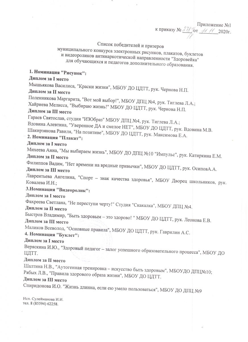 Опубликовано: 12.11.2020Подведены итоги муниципального конкурса антинаркотической направленности "Здоровейка", организаторами которого стали Управление образованием Исполнительного комитета Бугульминского муниципального района и МБОУ ДО Центр детского технического творчества. Дипломы победителей и сертификаты участников направлены по электронной почте заявителям на участие. Приказ об итогах: /upload/storage/org649/files/Приказ 001.jpg /upload/storage/org649/files/приложение 001.jpg
