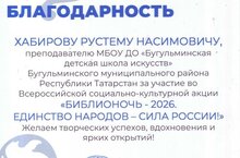В торжественной атмосфере в зале Дома Техники состоялся праздничный концерт, посвящённый Дню работника культуры. Почетной грамотой Главы Бугульминского муниципального района РТ за многолетний добросовестный труд и большой вклад в развитие культуры награждены: Хабиров Р.Н и