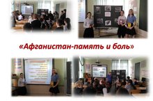 В рамках месячника оборонно-массовой и военно-патриотической работы в школе прошли классные часы, посвященные 30-летию вывода советских войск из Афганистана. 14 февраля в школе совместно с сельской библиотекой были проведены уроки мужества. Учащиеся почтили память павших минутой молчания. К памятной дате ,30-летию вывода советских войн из Афганистана,в школе оформлена выставка. Читатели могут познакомиться с произведениями авторов ,свидетелями той войны, а также документальными и художественными произведениями. Цель классных часов - воспитание у школьников гражданственности и патриотизма; привитие уважения к старшему поколению; духовное обогащение учащихся поэтическим и песенным наследием воинов-интернационалистов.