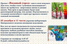 Уважаемые родители! Приглашаем Вас принять участие в городском Проекте "Вязаный город". Для того, чтобы стать" уличным вязальщиком", многого не требуется - шерстяные нитки и умение вязать. Чем ярче и креативнее будет ваш рукотворный шедевр, тем лучше. 23 декабря в 11 часов набережная Центрального водоема будет украшена Вашими шедеврами.