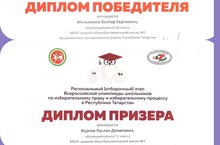 Учащиеся школы успешно выступили в региональном (отборочном) этапе Всероссийской олимпиады школьников по избирательному праву и избирательному процессу в Республике Татарстан: ученики 10 и 11 классов привезли дипломы победителя и призера. Поздравляем ребят и педагогов Абарову В.Ф., Благодарову Т.А. и желаем успехов в следующих этапах и других олимпиадах.