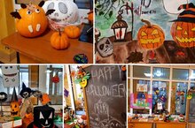 В завершающие учебные дни перед каникулами в школе решили отметить веселый праздник Хэллоуин! Страшно красивые тыквы, скелеты, гирлянды из приведений и бумажные летучие мыши украсили холл школы. Ученики потрудились на славу и сделали этот праздник ярким и запоминающимся!