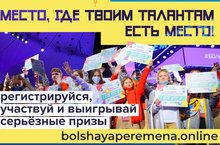 "Большая перемена 2021" уже стартовала! Это место, где ты можешь реализовать свои таланты, бросить вызов самому себе, стать победителем, выиграть бомбические призы и получить яркие впечатления на всю жизнь. Большая перемена — это сообщество для тех, кто готов меняться и менять мир. Здесь рулят не оценки, а способность нестандартно мыслить. ... Гражданин Российской Федерации: ученик школы 5-10 классов, студент СПО, иностранный гражданин, говорящий на русском языке. На "Большой перемене" ты найдёшь интересный для тебя вызов. Участвуй в конкурсе "Большая перемена" и получай призы.
