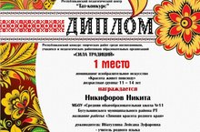 Никифоров Никита, ученик 7 класса МБОУ СОШ № 11 занял I место в Республиканском конкурсе творческих работ среди воспитанников,учащихся и педагогических работников образовательных организаций "Сила традиций", номинация: "изобразительное искусство "Красота живет повсюду". Рисунок "Зимняя красота родного края".