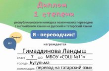 Гимаддинова Ландыш была удостоена Диплома 1 степени в Республиканском конкурсе поэтических переводов с английского языка на русский и татарский языки. Номинация: перевод на татарский язык. Руководитель: Ибатуллина Л.З.