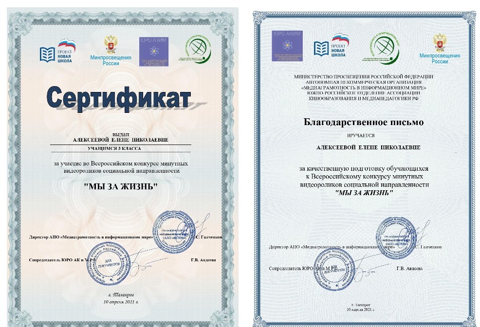 Учащиеся 3 класса МБОУ СОШ №11 вместе с классным руководителем Алексеевой Еленой Николаевной приняли участие во Всероссийском конкурсе минутных видеороликов социальной направленности "Мы за жизнь", в номинации "Мы за здоровый образ жизни" -