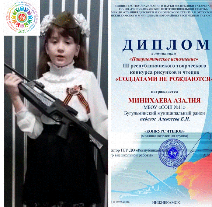 Азалия ученица 3 класса МБОУ СОШ №11 приняла участие в III Республиканском творческом конкурсе рисунков и чтецов "Солдатами не рождаются", номинация "Патриотическое исполнение" -