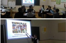 В рамках недели толерантности, проводимой в школе, учащиеся 7 класса провели для учеников 3 класса классный час на тему «Толерантность-что это?» Ученицы 7 класса объяснили, что такое толерантность. Младшие школьники увидели, что все мы похожие чем-то и разные, учились слушать друг друга. В игровой форме они учились быть толерантными. Подводя итоги, ребята высказались, что значит «быть толерантными» и отметили, что занятие им понравилось.