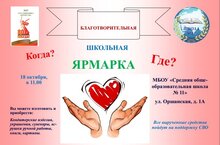 Приглашаем вас посетить благотворительную школьную ярмарку, которая пройдет в нашей школе № 11 по адресу ул. Оршанская д. 1А 18 октября 2025 года в 11:00.