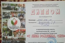 Прошёл муниципальный квест , посвящённый 30-летию Союза наследников Татарстана ,где учащиеся пятого класса школы №12 заняли первое место . Молодцы,ребята !
