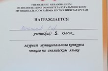 Обучающий нашей школы Маголимов Е., ученик 5 класса ,стал лауреатом муниципального конкурса чтецов по английскому языку.