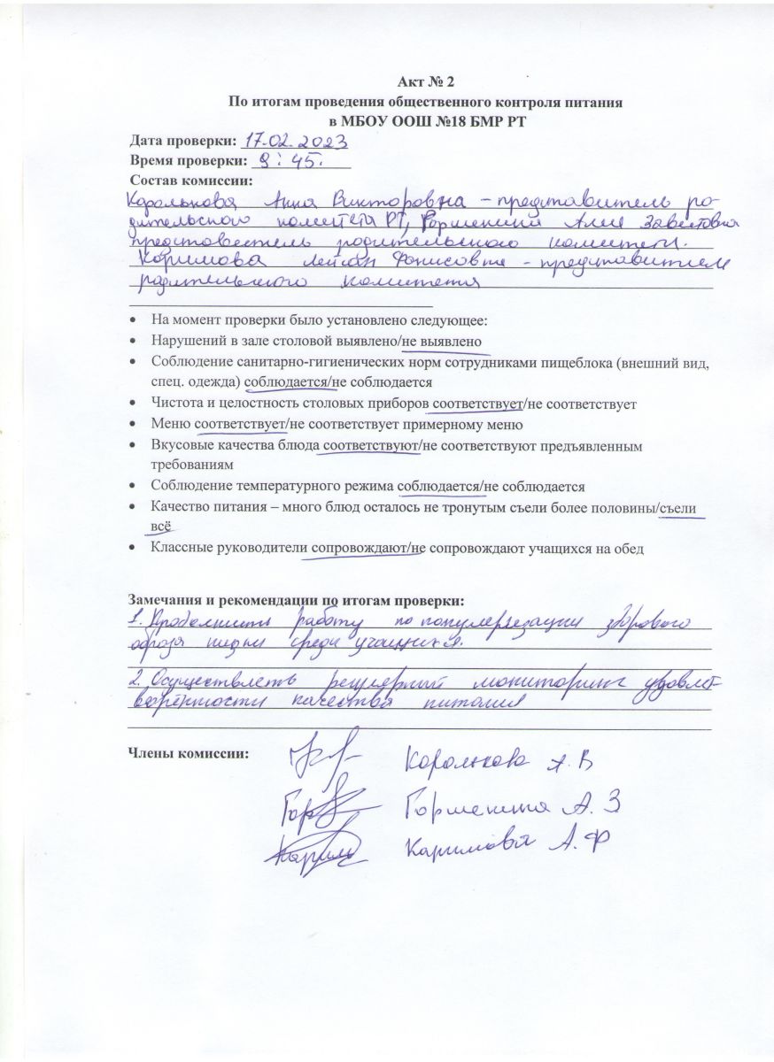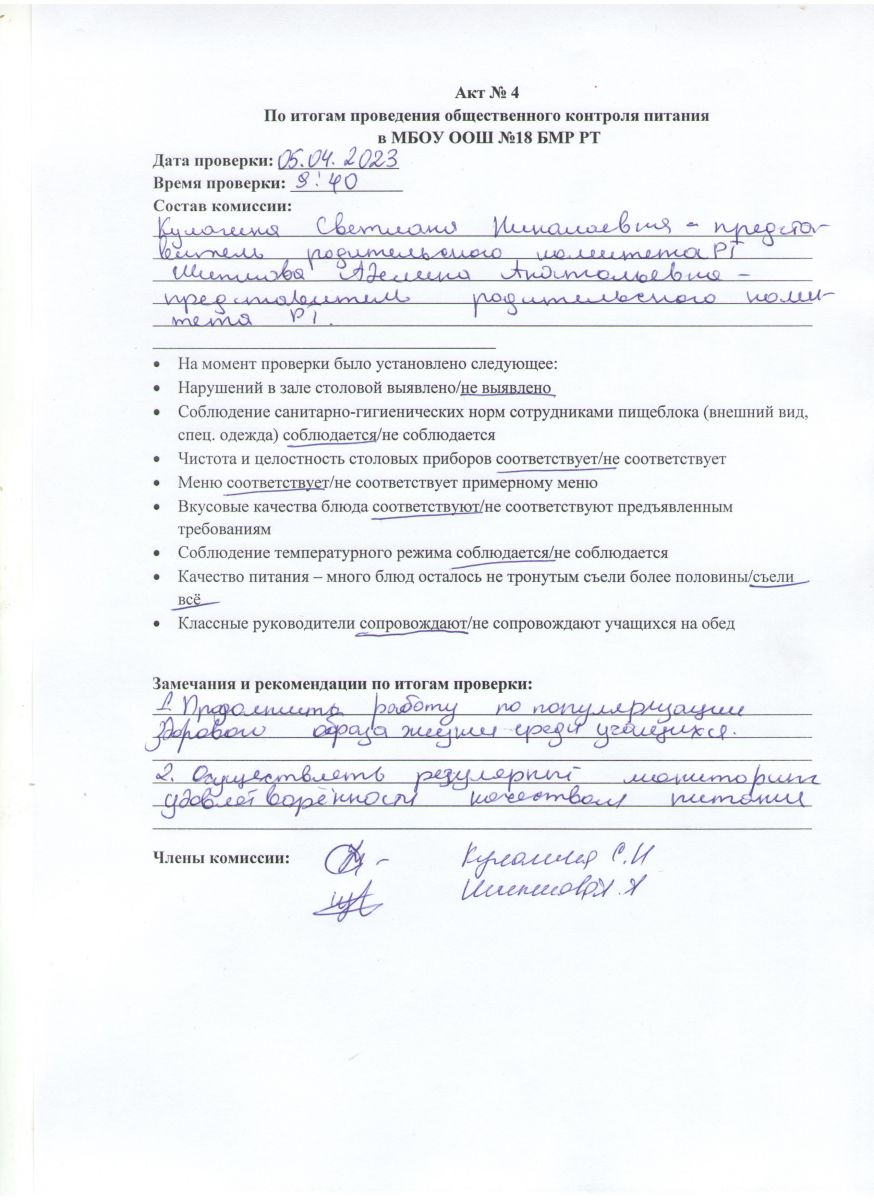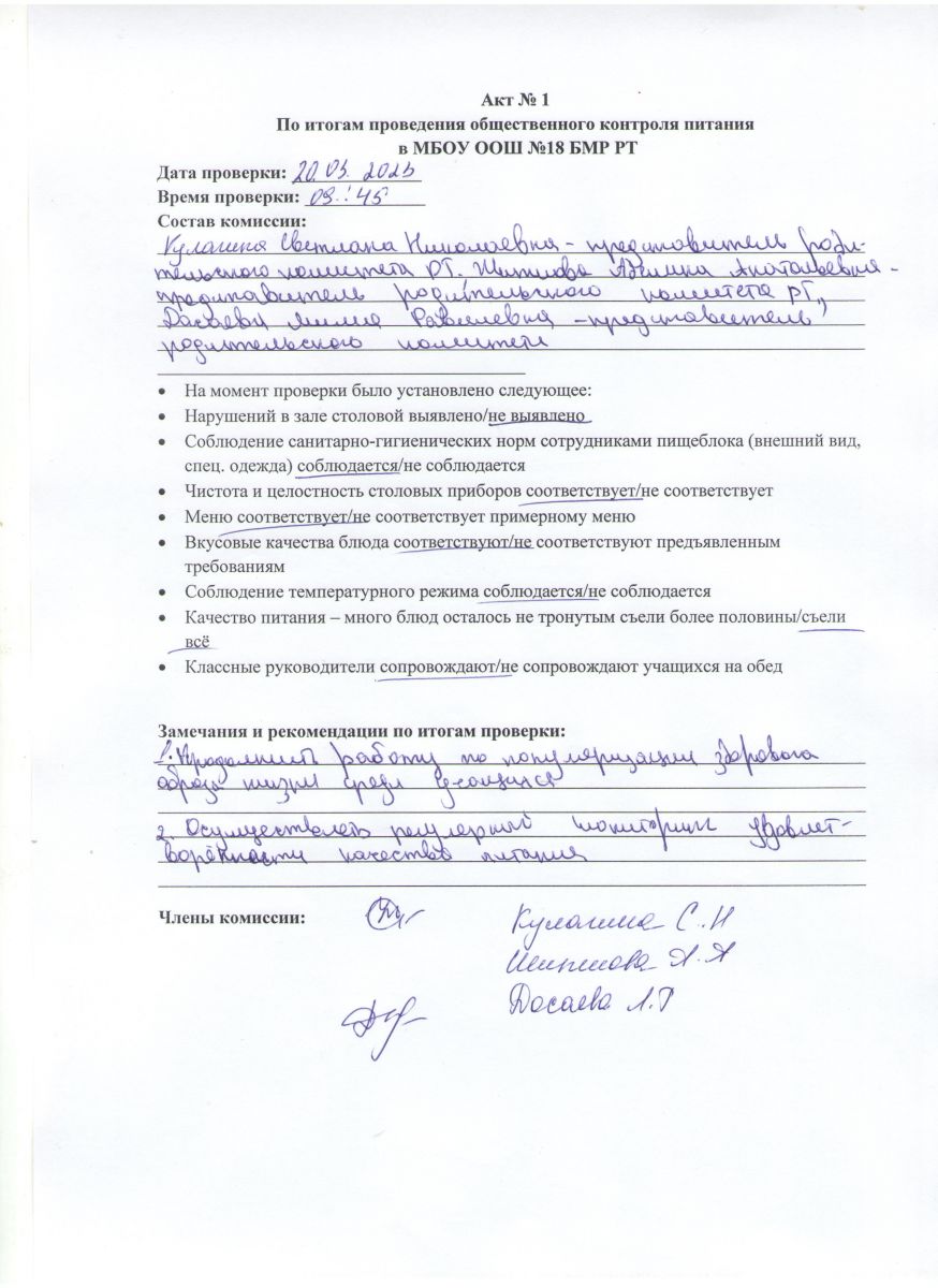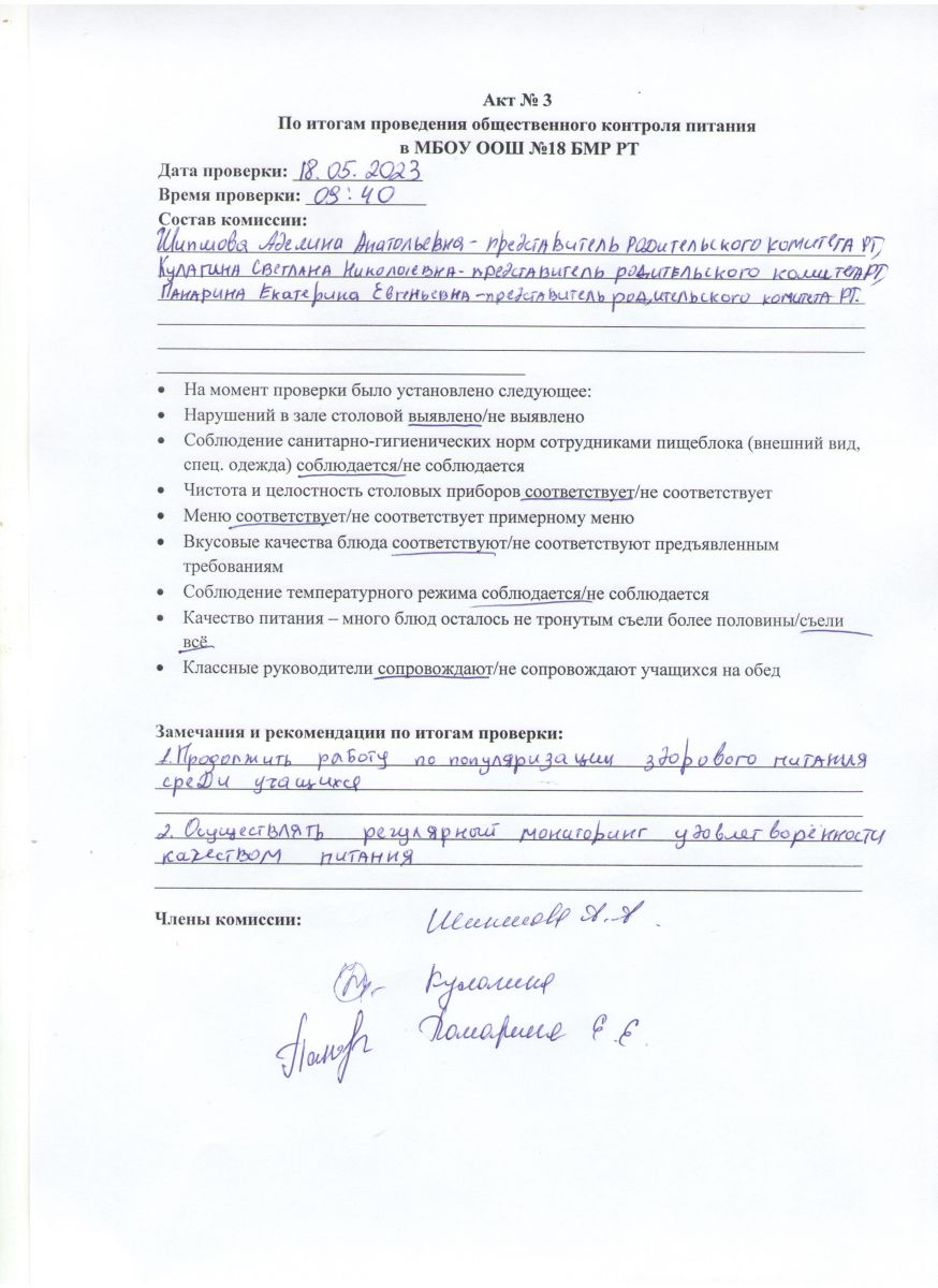 Акты по итогам проведения общественного контроля питания в МБОУ ООШ №18 БМР РТ