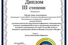 От всей души поздравляем ученицу 7 класса Лебедеву Лиану с блестящим выступлением на Региональной научно-практической конференции, посвященной знаменательной дате — 850-летию со дня рождения великого булгарского средневекового поэта Кул Гали.