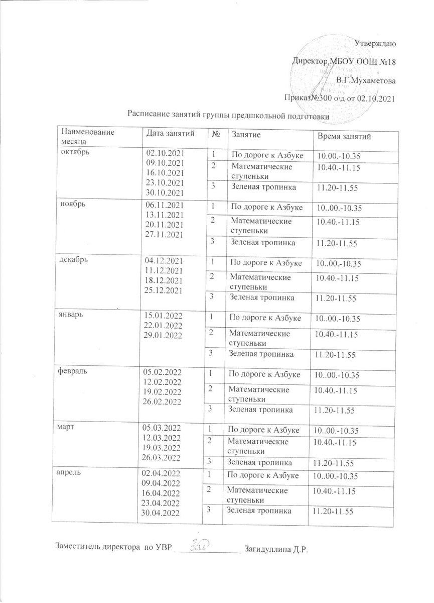 Расписание занятий группы предшкольной подготовки на 2021-2022 учебный год