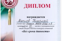 Ученик 9 класса Мазлов Николай занял IIIместо в муниципальном этапе Всероссийского конкурса сочинений «Без срока давности», посвящённого 75-летию Победы в Великой Отечественной войне. -